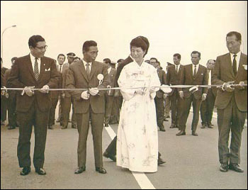 경부고속도로 개통식에서 테이프를 자르고 있는 박정희 전 대통령과 고 육영수 여사. 맨오른쪽은 고 정주영 현대그룹 명예회장이다.