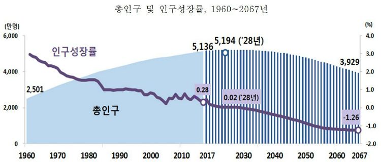 높은 수준의 출산율과 기대수명, 국제순유입을 가정한 고위 추계 시나리오를 적용하더라도 총인구는 2036년 5375만명을 정점으로 감소, 2067년엔 1996년 수준인 4547만명에 그칠 전망이다.