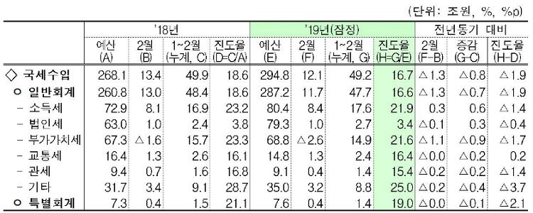 소득세는 설 상여금 지급월 차이로 근로소득세가 늘면서 일년전보다 3천억원 증가한 8조 4천억원이 2월 한 달간 걷혔다. 반면 부가가치세는 지난해말 수출 증가에 따른 환급이 늘면서 일년새 1조 1천억원, 관세는 수입 감소로 2천억원 각각 줄어들었다.