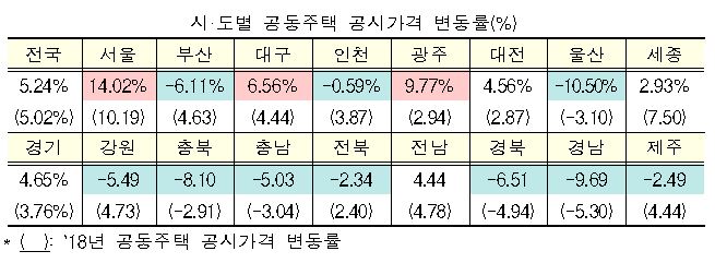 시도별로는 서울이 14.02%로 가장 많이 올랐지만, 당초 인상폭인 14.17%보다는 낮아졌다. 서울의 지난해 변동률은 10.19%였다.