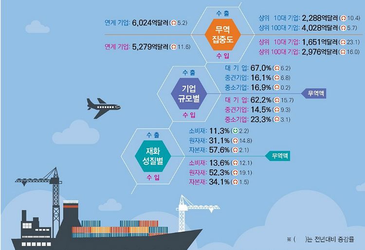 수출입 모두 상위 50대 기업이 무역액의 절반 이상을 차지하는 등 집중도가 확대됐다. 수출 상위 10대 기업은 전체 수출의 38.0%, 상위 50대 기업은 60.4%, 100대 기업은 66.9%를 차지했다. 수입 상위 10대 기업은 전체 수입의 31.3%, 50대 기업은 50.0%, 100대 기업은 56.4%를 차지했다.