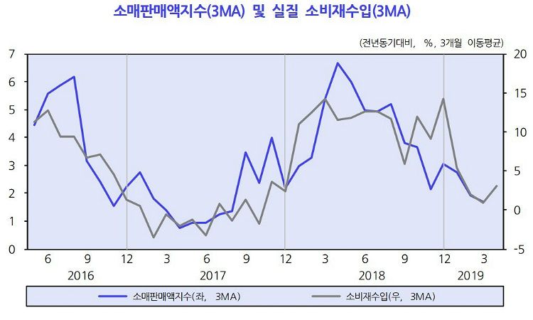 KDI는 "3월 서비스업생산은 여전히 저조하지만 소매판매액 증가폭이 확대됐다"며 "소비의 둔화 추세가 다소 완만해진 모습"이라고 평가했다.
