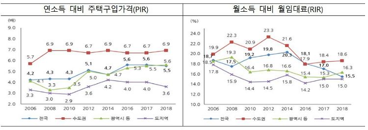 임차가구의 월소득에서 임대료가 차지하는 비율(RIR)은 15.5%로, 2017년의 17.0%보다 낮아졌다. 하지만 수도권은 18.6%로, 광역시의 16.3%나 도 지역의 15.0%보다 높게 나타났다.