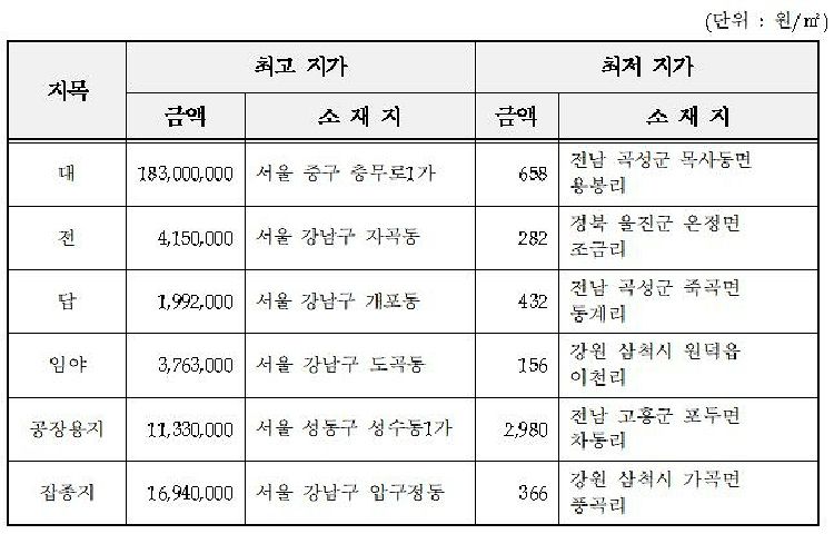 지목별로 보면 밭 최고가는 서울 강남구 자곡동으로 ㎡당 415만원, 논 최고가는 서울 강남구 개포동으로 ㎡당 199만 2천원이었다. 임야는 서울 강남구 도곡동으로 ㎡당 376만 3천원, 공장용지는 서울 성동구 성수동1가로 ㎡당 1133만원, 잡종지는 서울 강남구 압구정동으로 ㎡당 1694만원이었다.