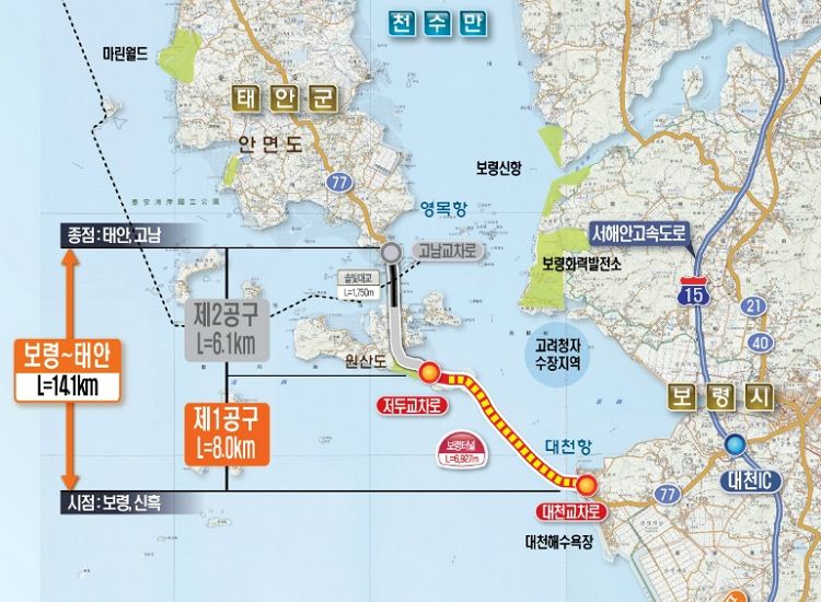 보령해저터널이 포함된 대천항-원산도 구간(8.0㎞)은 2021년말, 해상교량이 포함된 원산도-안면도 구간(6.1㎞)은 올해 12월 각각 개통할 예정이다.