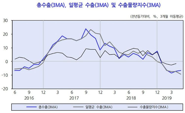 조업일수를 고려한 일평균 수출액도 전월의 -5.8%보다 감소폭이 확대된 –16.7%를 기록했다. KDI는 "설비투자 감소폭이 일부 축소됐지만 건설투자를 포함한 전반적인 흐름은 부진한 모습"이라며 "세계경기의 둔화 추세가 지속되면서 반도체와 석유류 등을 중심으로 수출 감소폭도 확대됐다"고 지적했다.