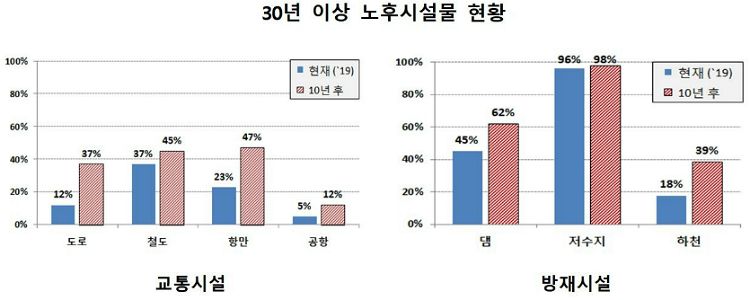 국내 주요 기반시설들은 1970년대부터 집중 건설돼 급속히 노후화되고 있다는 게 정부 판단이다. 실제로 중대형 SOC(사회간접자본)의 경우 30년 넘은 시설 비율은 저수지 96%, 댐 45%, 철도 37%, 항만 23%에 이른다.