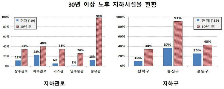지하시설물 역시 송유관·통신구 등은 20년 이상 비율이 90%를 웃돌고 있어, 10년 뒤엔 상당한 수준의 노후화가 불가피한 상황이다.