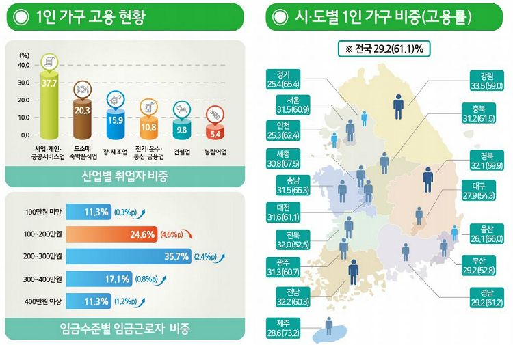취업중인 1인가구는 353만 7천가구로 일년새 10만 6천가구(3.1%) 증가했다. 이 가운데 남자는 204만 1천가구로 57.7%, 여자는 149만 6천가구로 32.3%였다.