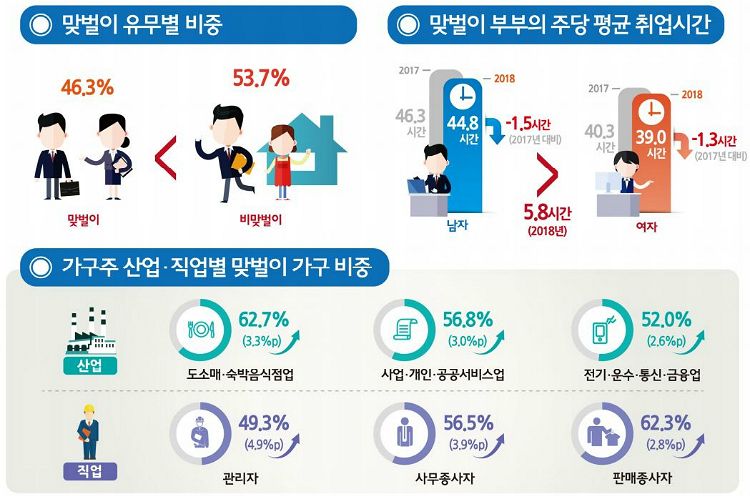 가구주가 취업자인 유배우 가구는 987만 4천가구로 일년전보다 5만 5천가구 감소했다. 가구주의 산업별 맞벌이 가구 비중은 농림어업이 83.4%로 가장 높았다.이어 도소매·숙박음식점업이 62.7%, 사업·개인·공공서비스업 등은 56.8%였다.