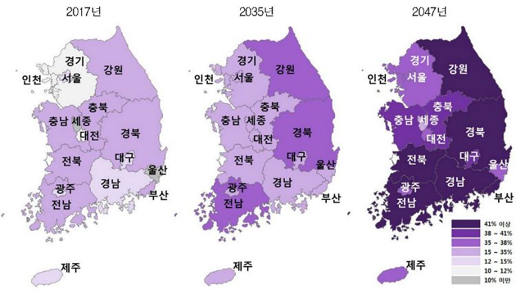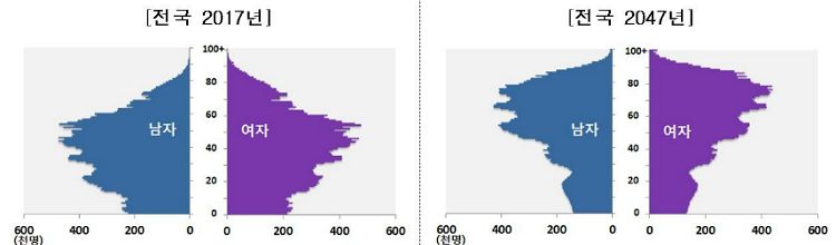 65세 이상 고령인구는 2017년엔 707만명으로 13.8%였지만, 베이비부머 세대 진입으로 2025년엔 1천만명을 넘어선 뒤 2047년엔 총인구의 38.4%인 1879만명에 이를 전망이다. 경기·제주를 제외한 7개 도지역과 부산에선 고령인구 비중이 40%를 넘어설 것으로 보인다.
