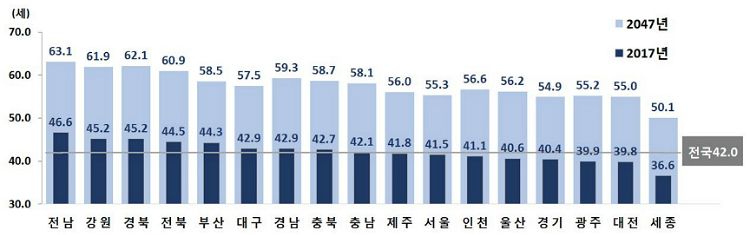 전체 인구의 한가운데 있는 사람의 나이를 가리키는 '중위연령'은 2017년 42.0세에서 2047년엔 56.8세로 15세 가까이 높아질 전망이다. 전남·경북·강원·전북의 중위연령은 2047년엔 60세를 넘어서고, 2017년에 36.6세였던 세종도 2047년엔 50.1세까지 오른다.