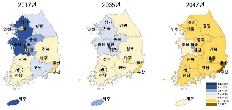 수도권 인구성장률은 2033년 마이너스로 바뀐 뒤 2047년엔 -0.64%까지 감소할 전망이다. 2017년 12.46%의 인구성장률을 보였던 세종을 제외하면 2044년 이후엔 모든 시도에서 인구가 줄어들 것으로 예측됐다.