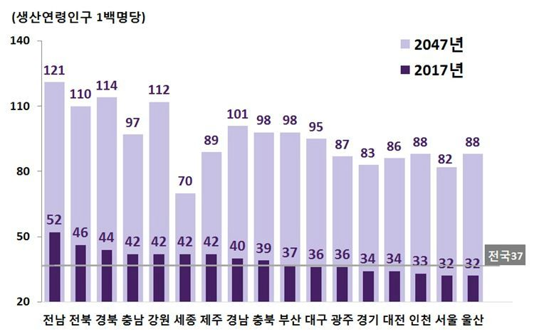 유소년인구 100명당 고령인구를 가리키는 '노령화지수'는 2017년 이미 100명을 넘어섰고, 2047년엔 417.2명까지 치솟을 전망이다. 전남·경북·강원·전북은 500명을 넘어서고, 가장 낮은 세종도 고령인구가 유소년인구의 두 배에 이르게 된다.