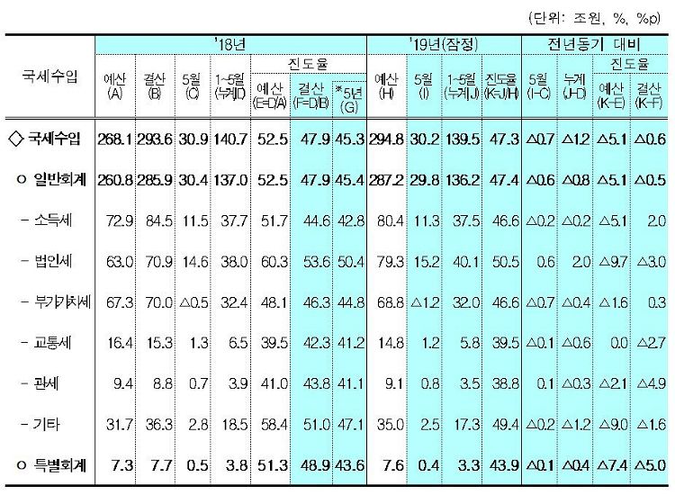 5월 총수입은 45조 1천억원으로 지난해 같은달보다 1조원 증가했지만, 국세수입은 30조 2천억원으로 7천억원 감소했다. 이 가운데 법인세는 3월 분납분 증가 등으로 절반인 15조 2천억원에 달했다.