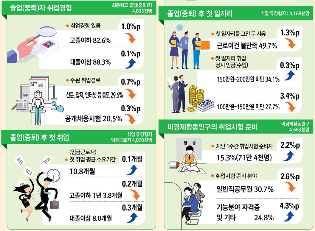 최종학교 졸업이나 중퇴후 첫 취업까지 걸리는 시간은 10.8개월로 일년새 0.1개월 증가했다. 첫 직장 평균 근속기간은 1년 5.3개월로 전년동월대비 0.6개월 감소했다. 졸업이나 중퇴후 취업 경험자 비율은 86.2%로 일년새 0.3%p 하락했다.