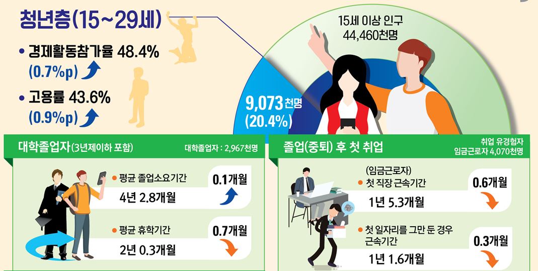 청년층 취업자는 395만 3천명으로 일년새 4만 6천명 증가한 반면, 실업자는 43만 7천명으로 2만 3천명 감소했다. 경제활동참가율은 48.4%로 같은 기간 0.7%p, 고용률은 43.6%로 0.9%p 각각 상승했다.