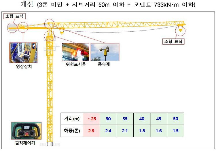 방안은 먼저 소형 타워크레인의 규격과 조종자격을 개선했다. 그동안 소형 타워크레인은 '3톤 미만'의 인양톤수 기준으로만 분류해왔지만, 국제기준과 해외사례 등을 참고해 지브 길이와 여기에 연동한 모멘트 기준이 도입된다.