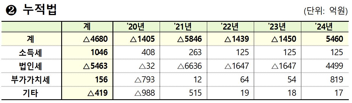 누적법 기준으로 보면 감세 기조가 한층 두드러진다. 향후 5년간 세수 감소분은 4680억원에 이르고, 특히 법인세 감소분은 5463억원에 이를 것으로 추산됐다.