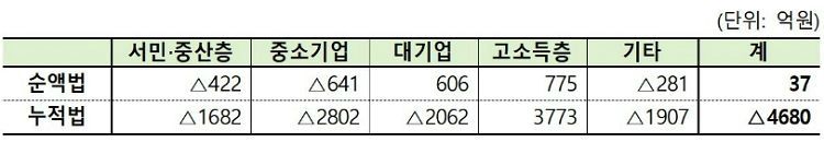 기재부는 '직전년도 기준'인 순액법으로 보면 향후 5년간 세수가 37억원 증가할 것으로 추산했다. 내년과 내후년 세수는 각각 1405억원과 4441억원 줄어들지만 2022년엔 4407억원 증가할 거란 입장이다.