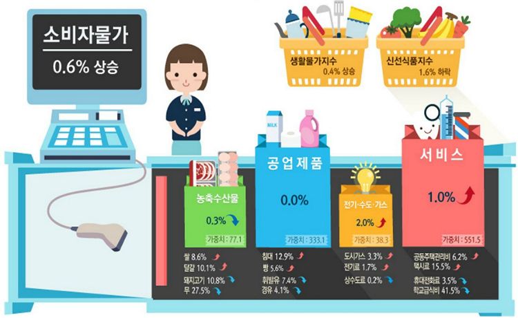 통계청 이두원 물가동향과장은 "기상 양호로 출하량이 늘어 채솟값이 하락했고, 석유류는 국제유가 하락과 유류세 인하로 내렸다"며 "서비스 물가도 1.0% 상승에 그쳤다"고 설명했다.