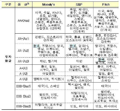 가장 높은 'AAA' 등급은 미국과 독일 등 11개국, 그 다음인 'AA+'는 홍콩과 핀란드 및 오스트리아 등 3개국, 'AA'는 영국과 프랑스 등 5개국이다.