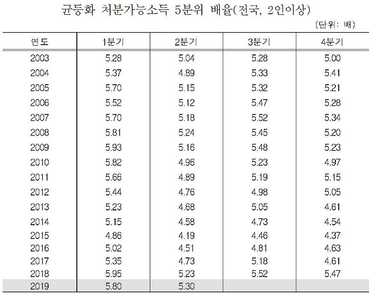 이러다보니 상위 20%의 균등화 처분가능소득을 하위 20%의 소득으로 나눈 '5분위 배율'은 2분기에 5.30배를 기록했다. 이전 분기의 5.80배에 비해선 나아진 수치이지만 지난해 2분기의 5.23배는 물론, 관련 통계가 작성된 2003년 이래 2분기로는 가장 높았다.