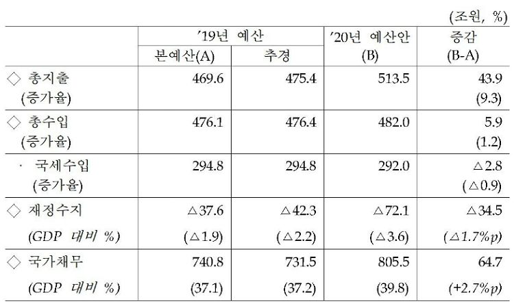 GDP(국내총생산) 대비 재정수지는 올해 본예산 기준 37조 6천억원 적자에서 두 배가량인 72조 1천억원 적자로 폭이 커질 전망이다. 전년 대비 1.9% 감소에서 3.6% 감소로 수지가 악화되는 셈이다.