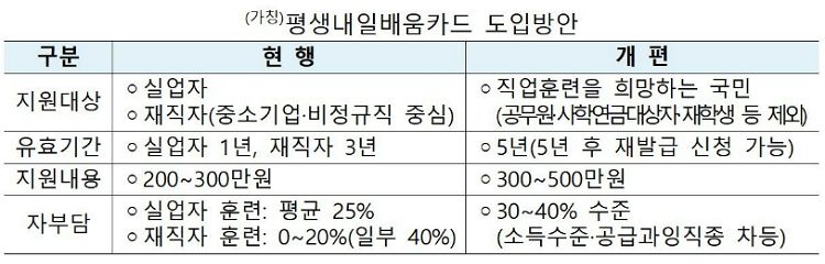 그동안 분리 운영돼온 실업자와 재직자 내일배움카드는 통합 개편된다. 카드 유효기간도 현행 '실업자 1년, 재직자 3년'에서 '5년'으로 늘리고, 지원금액도 200만~300만원에서 300만~500만원으로 확대한다.