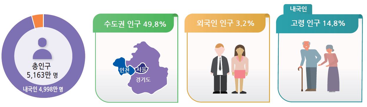 우리나라 인구 5163만명 가운데 절반에 가까운 2571만명이 수도권에 몰려있는 것으로 나타났다. 다문화 가구원은 101만명으로 총인구의 2%를 차지했고, 주택 1763만호 가운데 절반 가까운 840만호는 20년이 넘은 것으로 조사됐다.