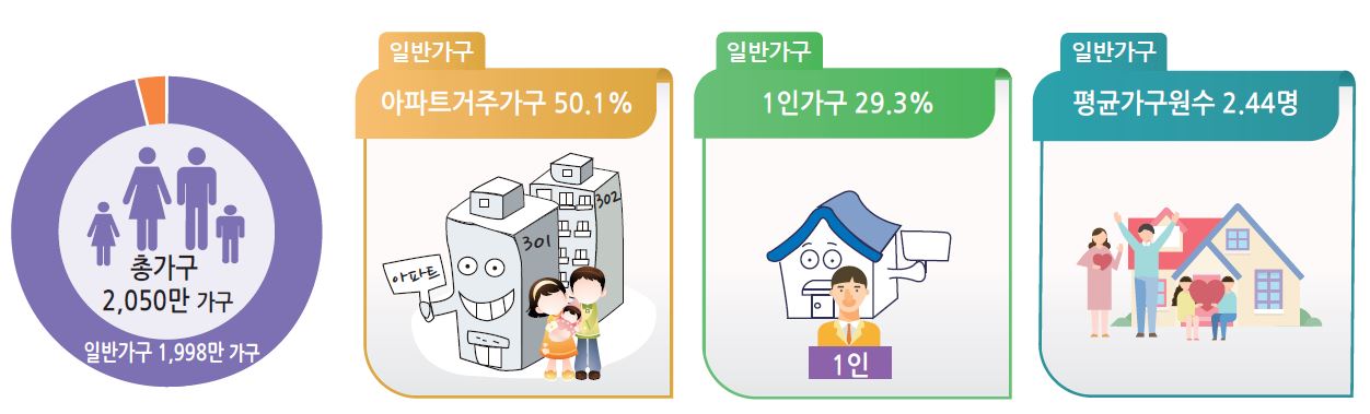 주택유형별 거주 가구 비율은 아파트가 50.1%인 1001만 가구로 가장 많았고, 단독주택은 32.1%인 62만 가구였다. 전국 주택은 1763만호로 일년새 51만호(3.0%) 증가했고, 이 가운데 61.4%인 1083만호는 아파트였다.