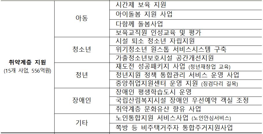 신규 사업 가운데 15개는 아동·청소년·청년·장애인 등 취약계층 지원을 위한 사업으로 556억원이 배정됐다. △시간제 보육지원 △다함께 돌봄사업 △시설퇴소 청소년 자립지원 △장애인 평생학습도시 운영 등이 포함됐다.