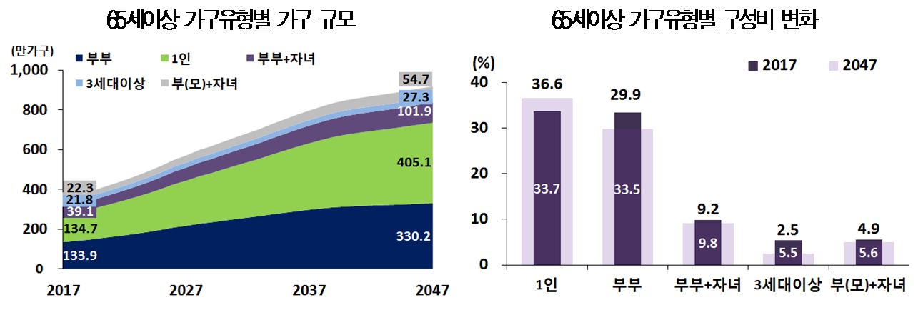 저출산 고령화 현상이 심화되면서 가구주가 65세 이상인 고령자 가구는 2017년 399만 8천 가구에서 2047년엔 1105만 8천 가구로 2.8배 급증할 전망이다. 총가구의 20.4% 수준에서 30년 뒤엔 49.6%까지 치솟게 된다는 얘기다.