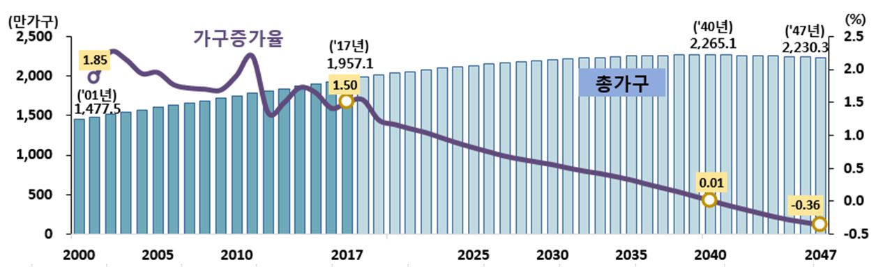 2017년 기준 1.50%였던 가구증가율은 2041년부터 마이너스로 전환, 2047년엔 -0.36%에 이를 것으로 예상됐다. 평균 2.48명이던 가구원수는 2047년엔 2.03명까지 감소할 전망이다.