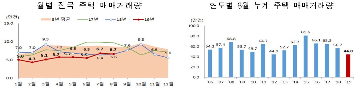 올들어 8월까지 거래량은 44만 7963건으로 지난해 같은기간보다 21.0%, 5년평균에 비해선 32.6% 줄어들었다.