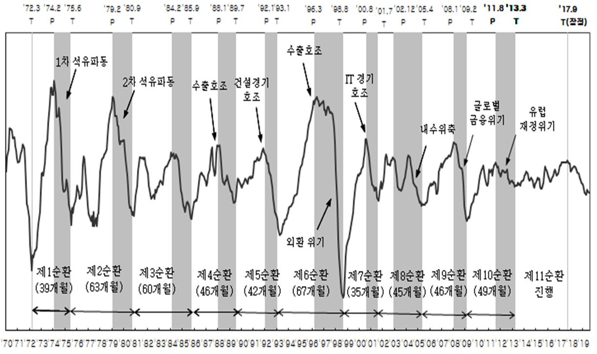 한 차례 결정이 보류됐던 국내 경기의 '최근 정점'이 2017년 9월로 설정됐다. '최근 저점'으로 확정된 2013년 3월 이후 역대 최장 기간인 54개월간 경기가 상승하다가 역대 3번째로 긴 24개월째 하강중이란 얘기다.