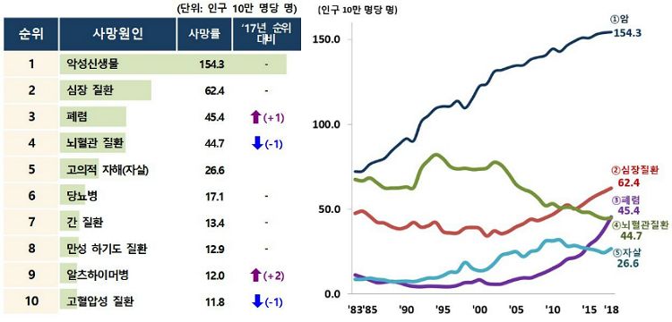 통계청 관계자는 "11위였던 알츠하이머병이 9위에 오른 것도 고령화 영향"이라며 "뇌혈관 질환과 당뇨병은 감소 추세를 나타냈고, 운수사고는 통계작성 이래 처음 1대 사인에서 제외됐다"고 설명했다. 10대 사인은 전체 사망원인의 68.8%를 차지했다.