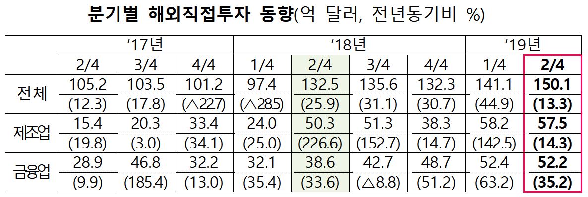27일 기획재정부에 따르면 지난 4~6월 해외직접투자액은 150억 1천만 달러로, 지난해 2분기의 132억 5천만 달러에 비해 13.3%, 1분기에 비해선 6.3% 증가했다.