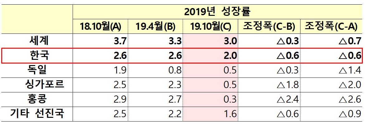 IMF(국제통화기금)가 한국의 올해 경제성장률 전망치를 2.0%로 하향조정했다. 지난 4월의 2.6% 전망에서 6개월새 0.6%p나 낮춘 수치다.