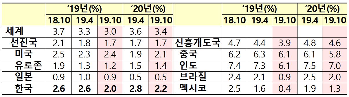 올해 세계 경제성장률 전망치는 지난 4월의 3.3%에서 0.3%p 낮춘 3.0%로, 내년 전망치는 4월의 3.6%에서 3.4%로 0.2%p 하향했다. 세계 경제의 하향치보다 한국 경제의 하향 폭을 더 크게 본 셈이다.
