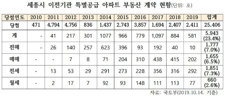 특별공급 당첨 물량 가운데 전세는 1851호로 7.3%, 전매는 1777호로 7%, 매매는 1655호로 6.5%, 월세는 660호로 2.6%였다. 특별분양을 받은 공무원 등 4명 가운데 1명이 집을 팔거나 임대를 줬단 얘기다.