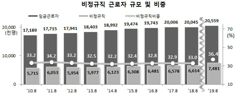2010년만 해도 비정규직 규모는 8월 기준 571만 5천명으로 33.2%를 차지했다. 2017년 657만 8천명에서 지난해 661만 4천명으로 4만명 늘었던 데 비하면 올해 결과는 그보다 22배가량 폭증한 셈이다.