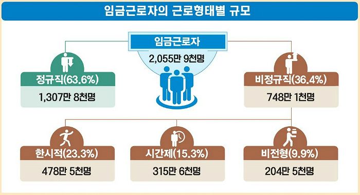 시간제 노동자는 일년전 270만 9천명에서 315만 6천명으로 447만명 증가했다. 비전형 노동자만 207만 1천명에서 204만 5천명으로 2만 6천명 감소했다.