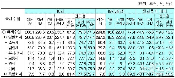 9월 국세수입은 18조 6천억원으로 전년동월 대비 1조 9천억원, 누계치는 228조 1천억원으로 5조 6천억원 감소했다. 세수진도율은 77.4%로 전년동기의 79.6%보다 소폭 하락했다.