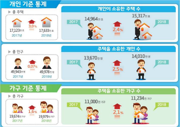 가구 단위로 보면 주택을 소유한 1123만 4천 가구 가운데 한 채만 가진 가구가 72.6%인 815만 3천 가구였다. 2채 이상을 가진 가구는 19.9%인 224만 가구, 3채를 가진 가구는 4.7%인 53만 3천 가구였다.