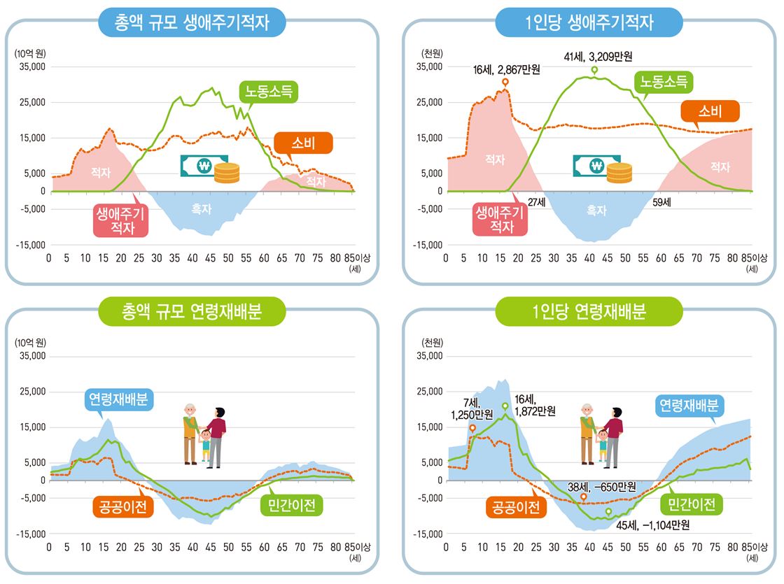 1인당 생애주기적자는 16살에서 2867만원으로 최대 적자를 보였다. 41살엔 1435만원으로 최대 흑자였다. 1인당 생애주기적자는 연령 증가에 따라 '적자→흑자⟶적자'의 3단계 양상을 나타냈다. 27살에 흑자로 진입한 뒤 59살에 적자로 바뀌는 식이었다.