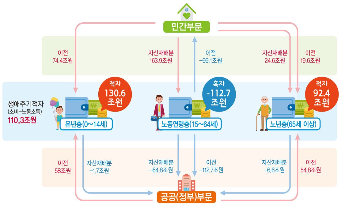 유년층은 공공 이전 58조원, 민간 이전 74조 4천억원 등 이전을 통한 순유입이 대부분이었다. 노동연령층은 이전을 통한 순유출이 211조 8천억원, 자산재배분을 통한 순유입이 99조 1천억원이었다.