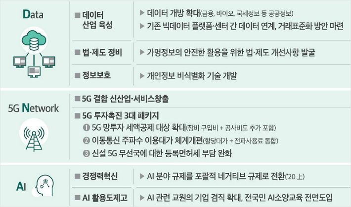 정부는 DNA 확산 및 '포스트 반도체' 육성 을 위해 데이터 3법 개정과 연계해 데이터경제 혁신을 가속화하고, 특히 5G 투자촉진 3대 패키지를 마련하기로 했다. DNA는 데이터(Data)·네트워크(5G)·AI 등 혁신 인프라, 빅3는 시스템반도체·바이오헬스·미래차 등 3대 신산업을 지칭하는 용어다.